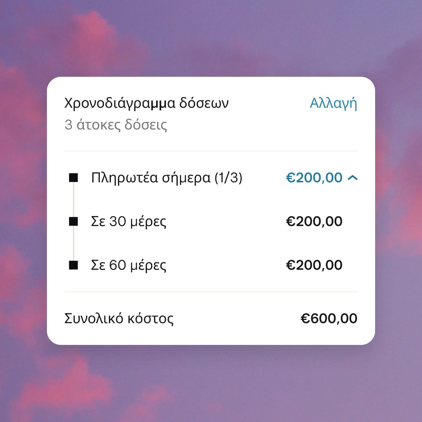 Αφού κάνετε την πρώτη σας πληρωμή, θα χρεώνουμε αυτόματα την κάρτα σας κάθε 30 ημέρες για τις επόμενες δόσεις. Θα φροντίσουμε να ενημερωθείτε εγκαίρως. Χωρίς τόκους ή έξοδα.