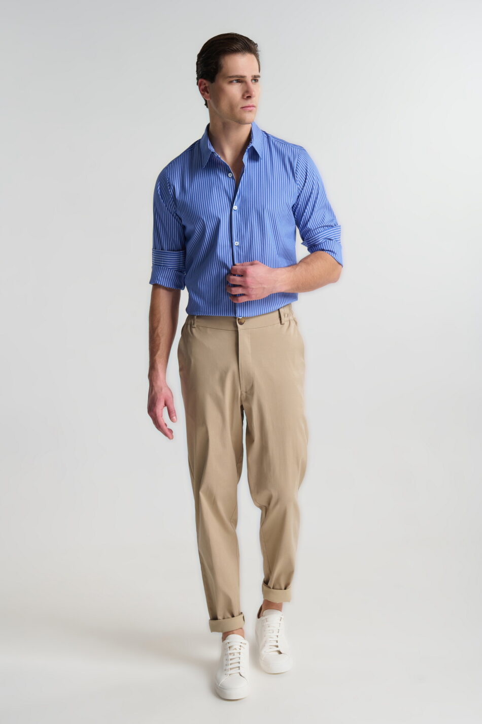 Ανδρικό παντελόνι smart casual, ένα σύμβολο διαχρονικής κομψότητας και φινέτσας. Σχεδιασμένο για τον άνδρα που εκτιμά το αψεγάδιαστο στυλ, αυτό το παντελόνι προσφέρει μια καθαρή, ίσια γραμμή που κολακεύει κάθε σωματότυπο.
