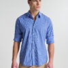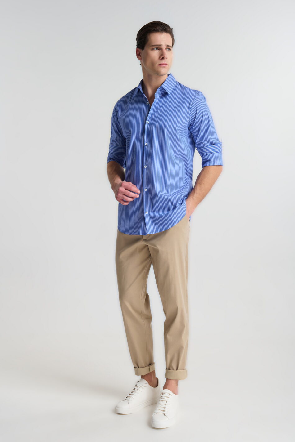 Κομψό ανδρικό ριγέ πουκάμισο σε μπλε και λευκό με μοντέρνα γραμμή. Ιδανικό για office, smart-casual & βραδινές εμφανίσεις.