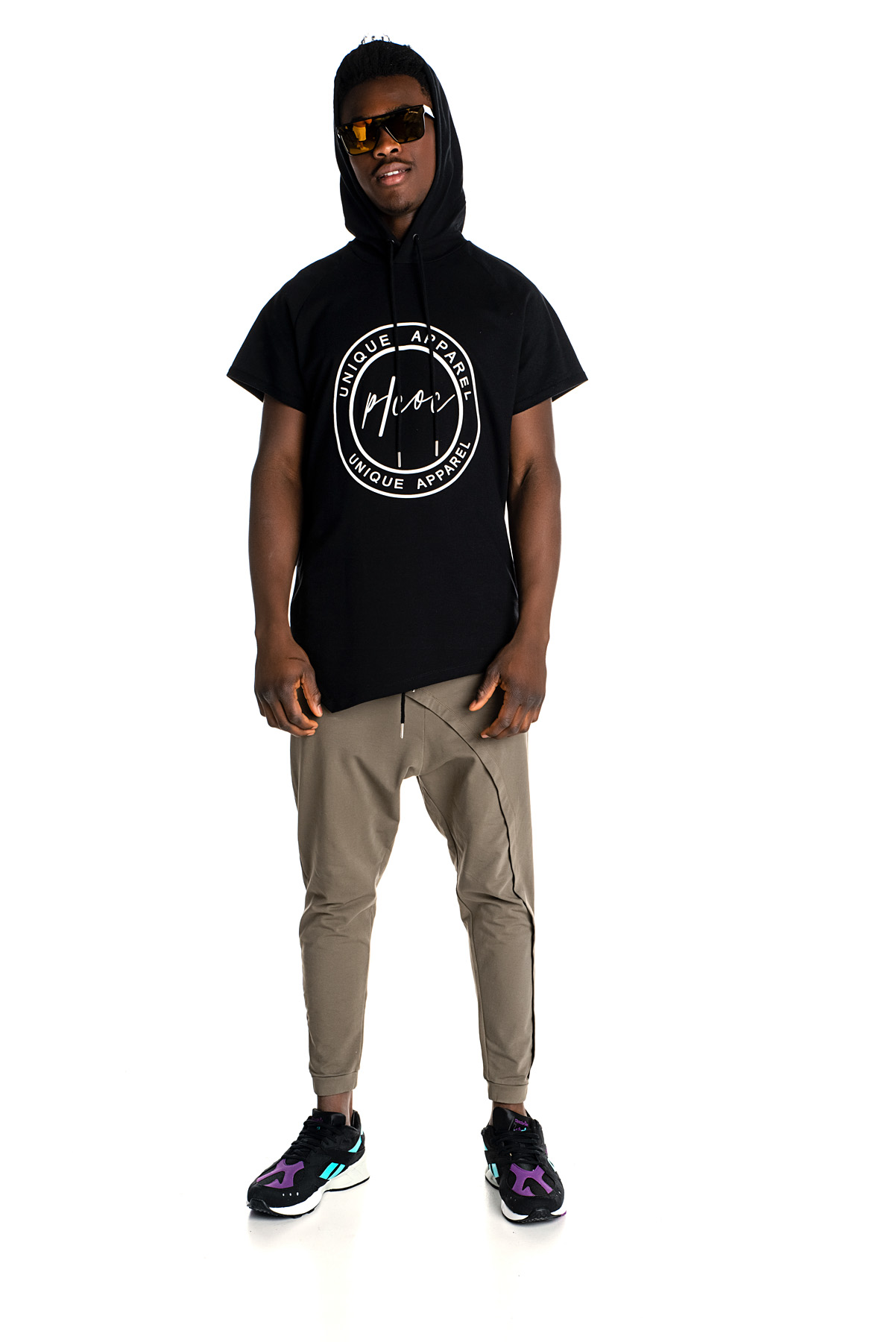 Black P/COC spring hoodie with asymmetric details and logo in front